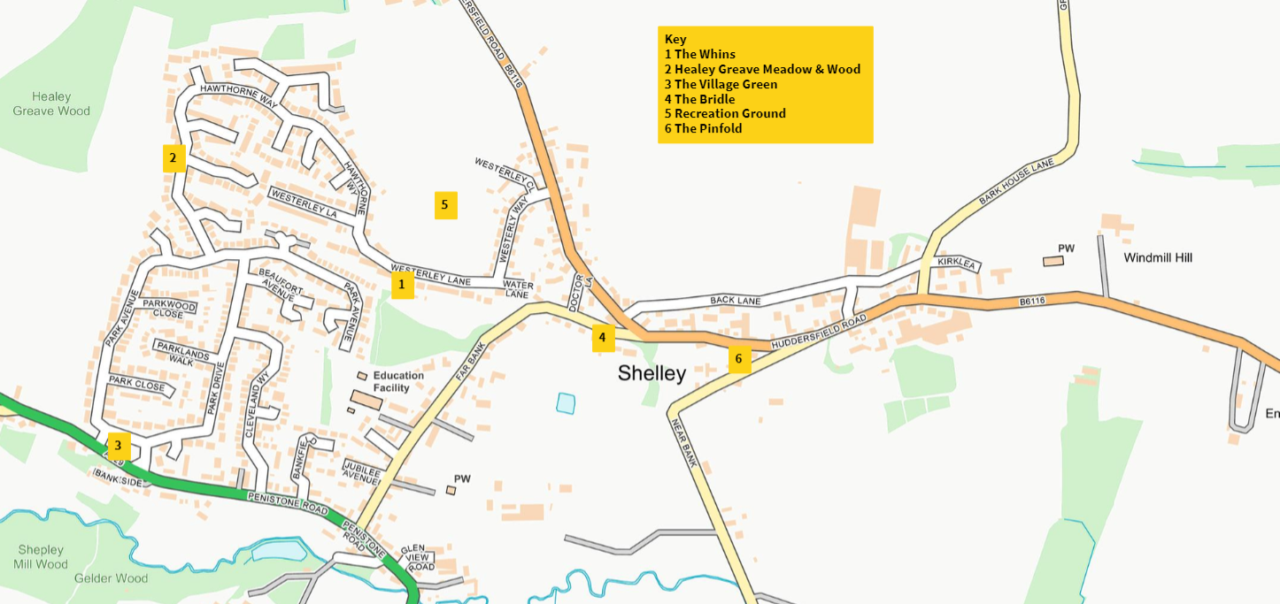 Click on a picture below to find out more about Shelley or find out more information when out and about by scanning the QR code at our brown open spaces signs, see the "Find our Open Spaces" picture for their location (see below for larger picture, click to enlarge)